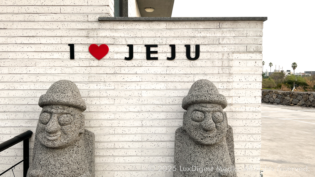 입구부터 제주의 선진 음식점임을 강조하는 돌하루방이 세트로 광고하고 있습니다.